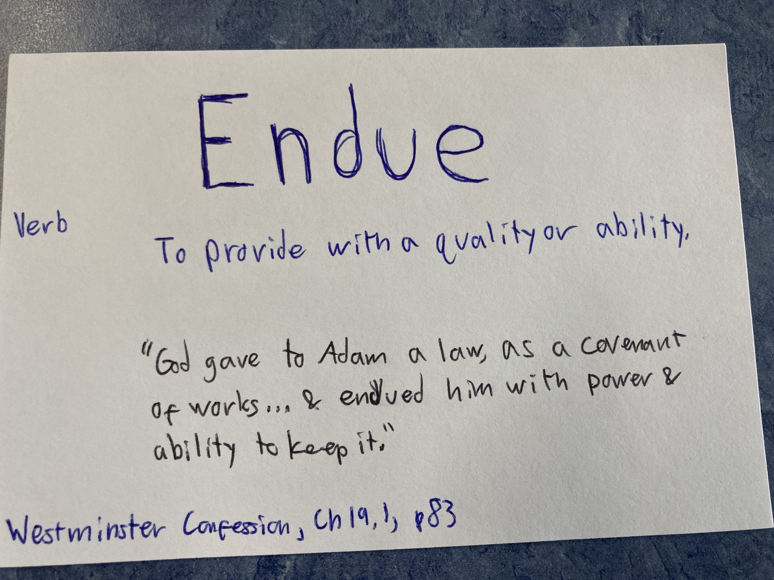 - Endue – v. To provide with a quality or ability.