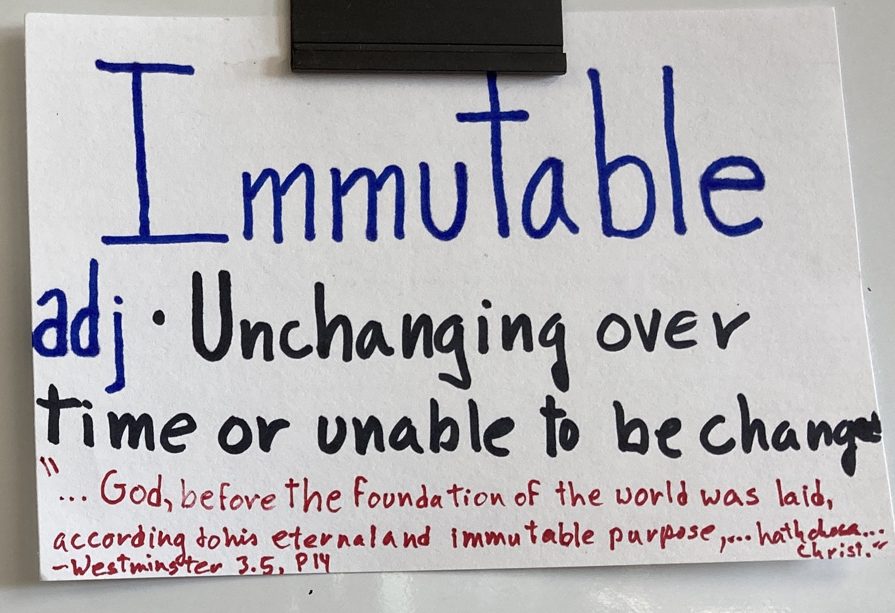 - Immutable – adj. Unchanging over time or unable to be changed.