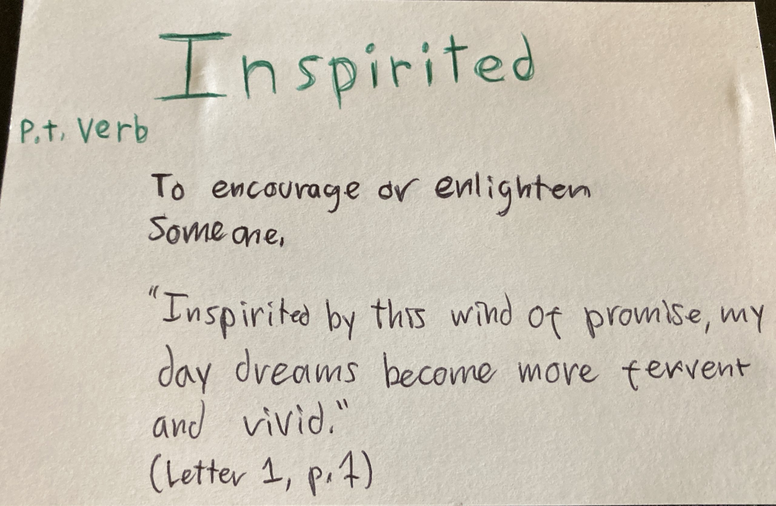 - Inspirited – p.t. v. To encourage or enlighten someone.