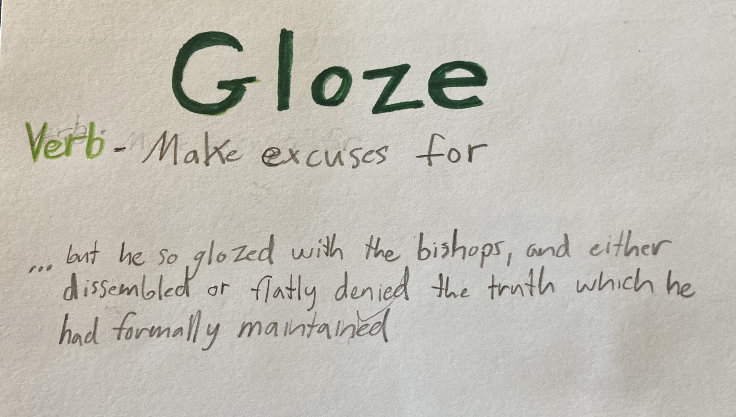 - Gloze – v. Make excuses for.
