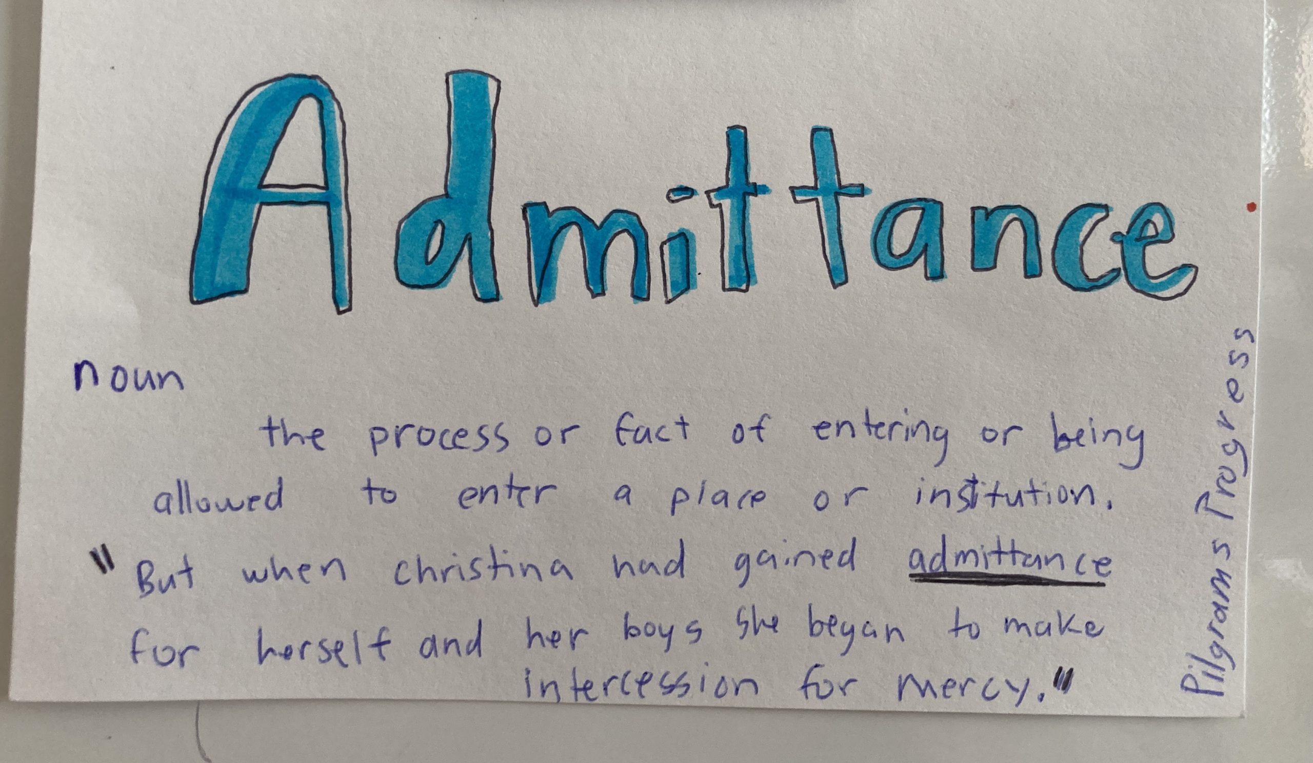 - Admittance -n., the process or fact of entering or being allowed to enter a place or institution.