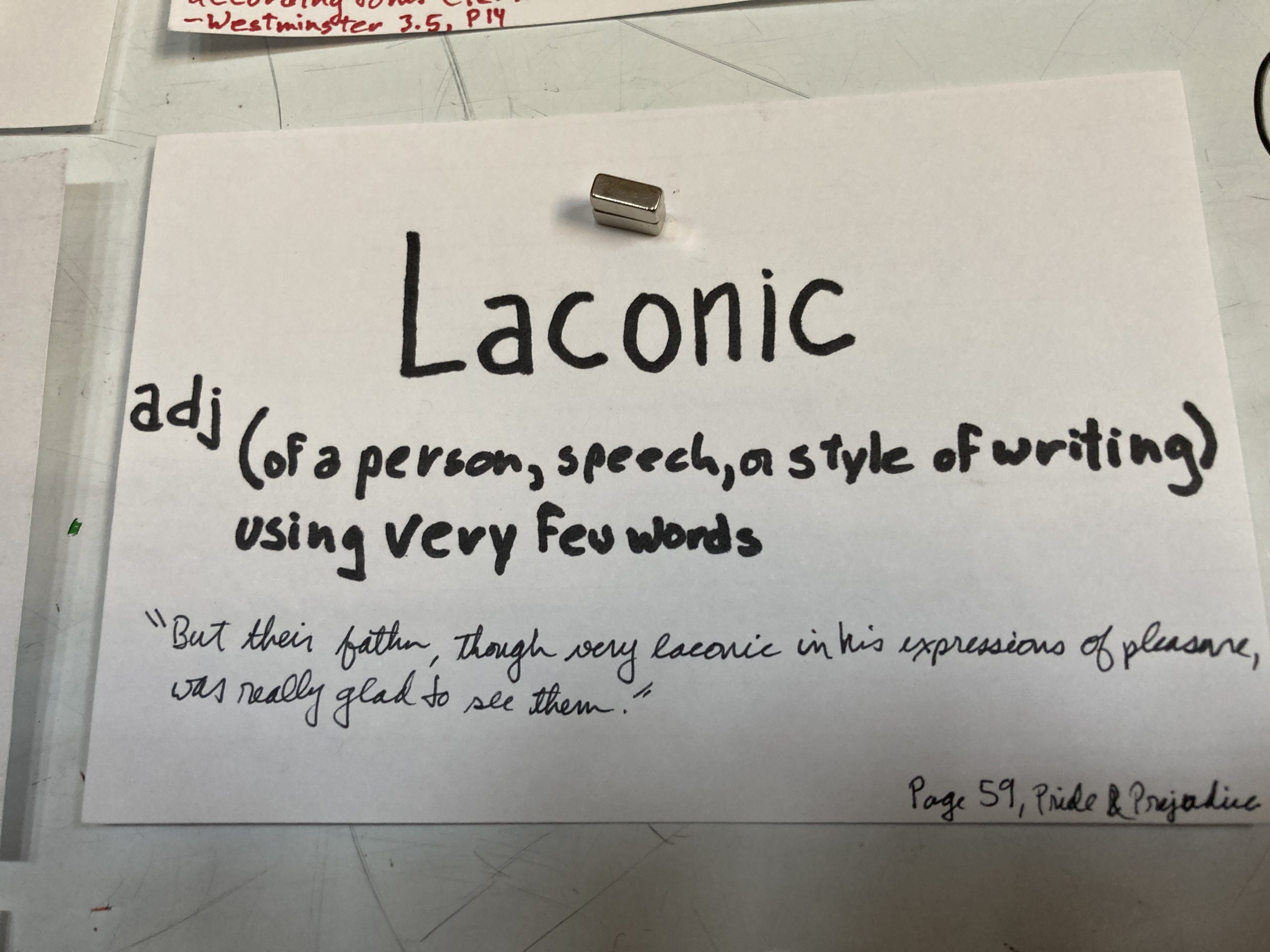 - Laconic – adj. (of a person, speech, or style of writing). Using very few words.