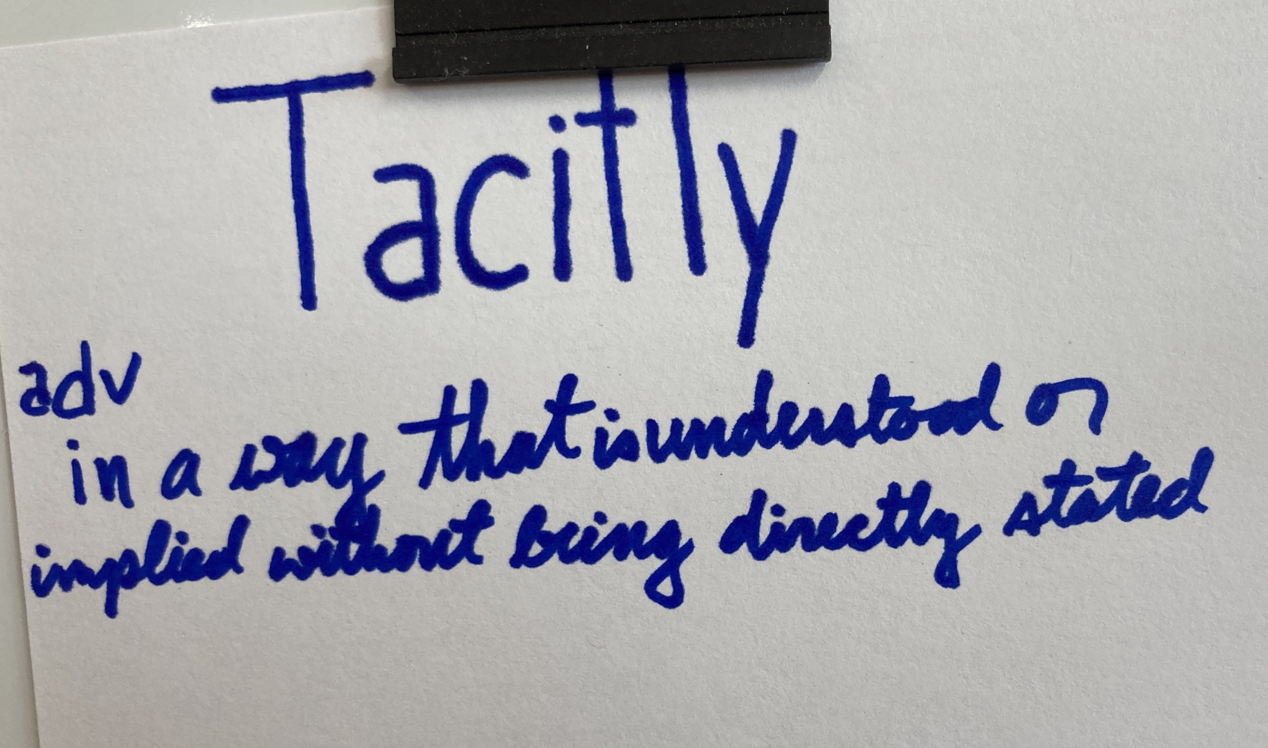 - Tacitly – adv. In a way that is understood or implied without being directly stated