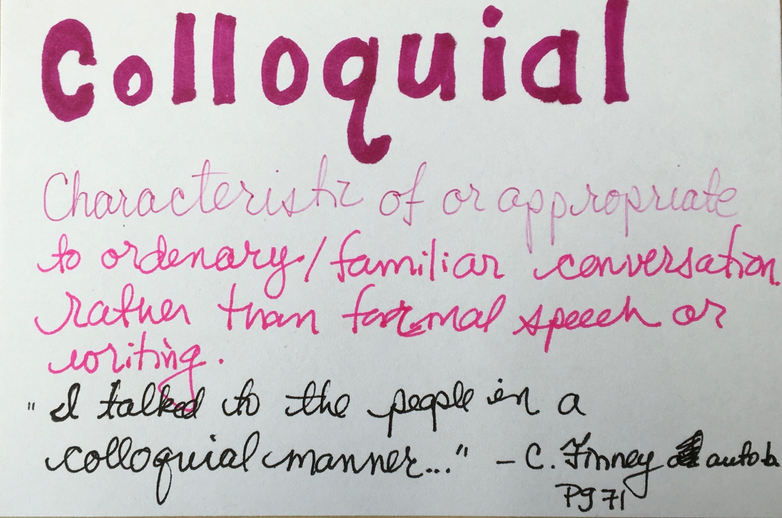 - Colloquial – Characteristic of or appropriate to ordinary/familiar conversation rather than formal speech or writing.