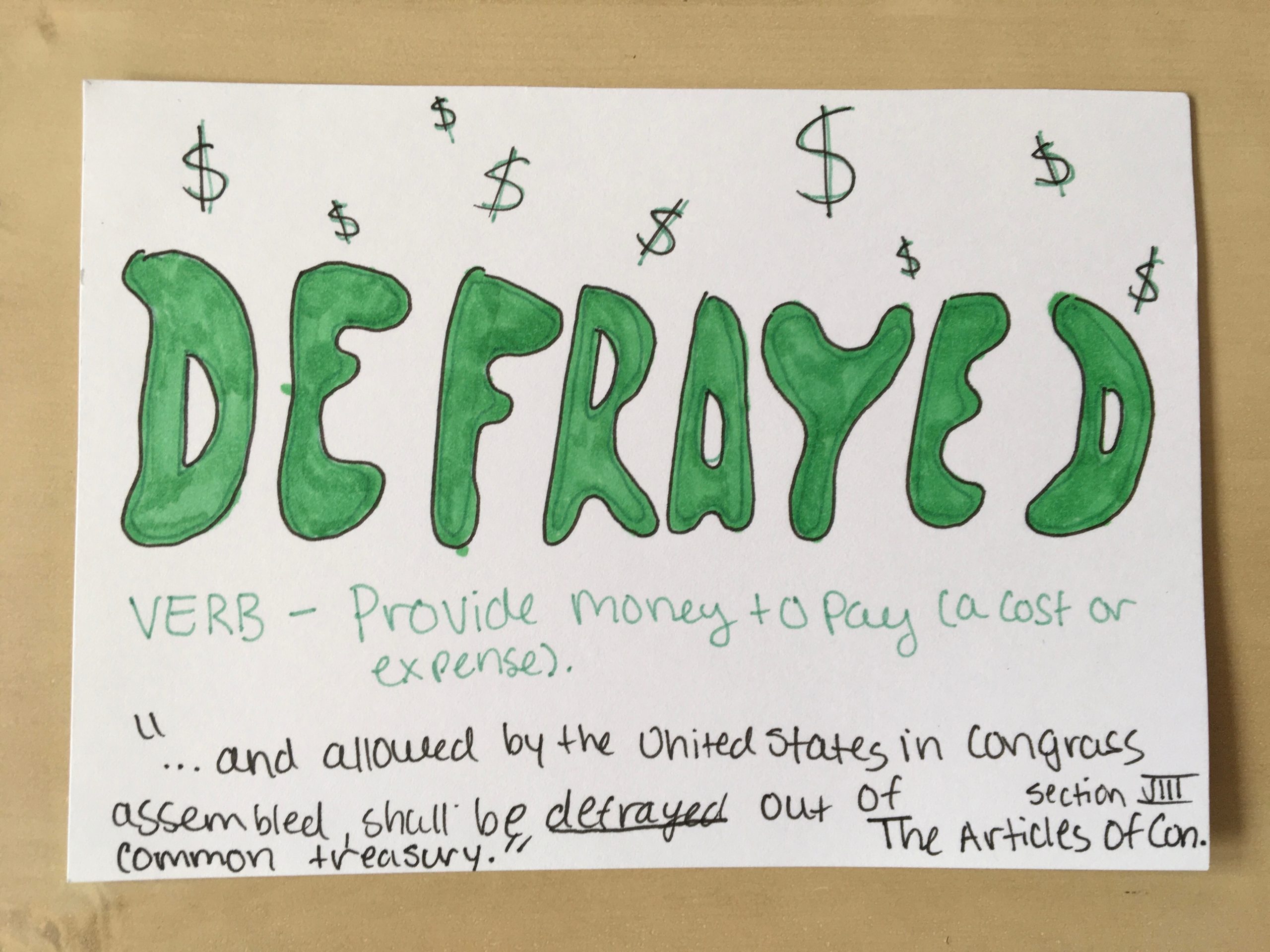 - Defrayed – v. Provide money to pay (a cost or expense).