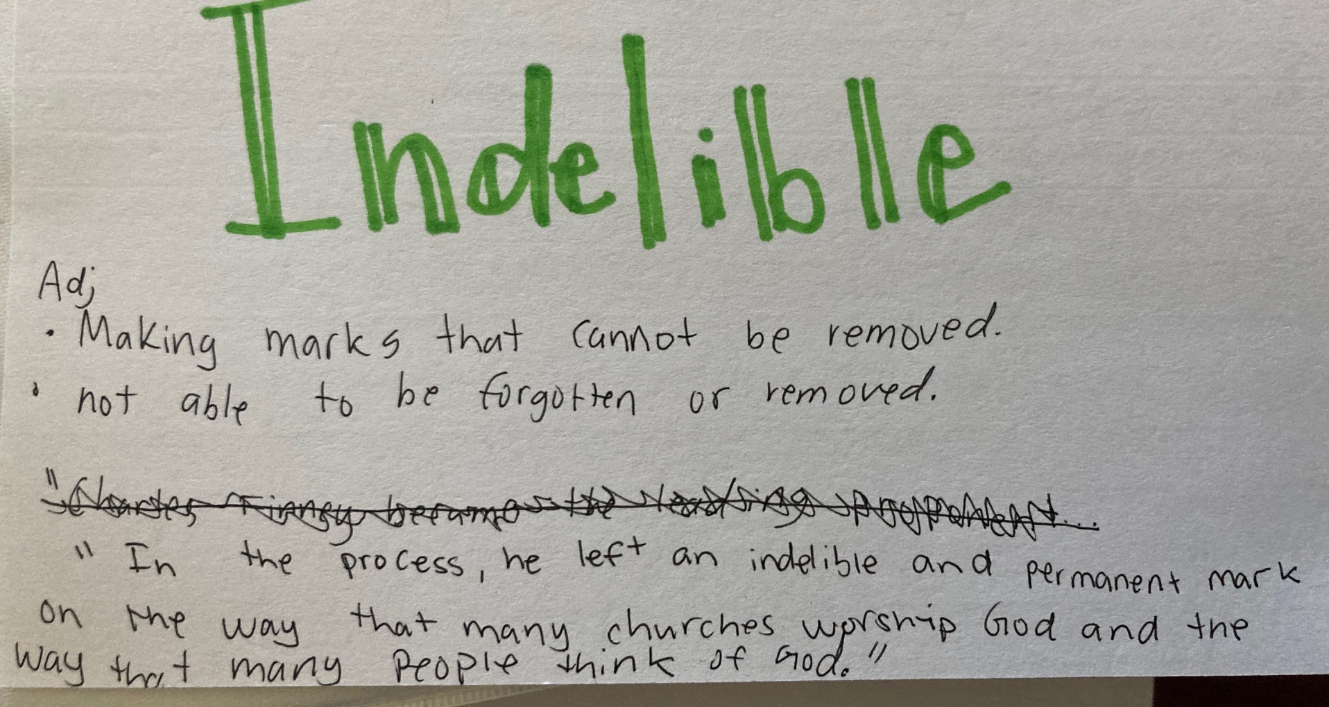 - Indelible – adj. Making marks that cannot be removed. Not able to be forgotten or removed.