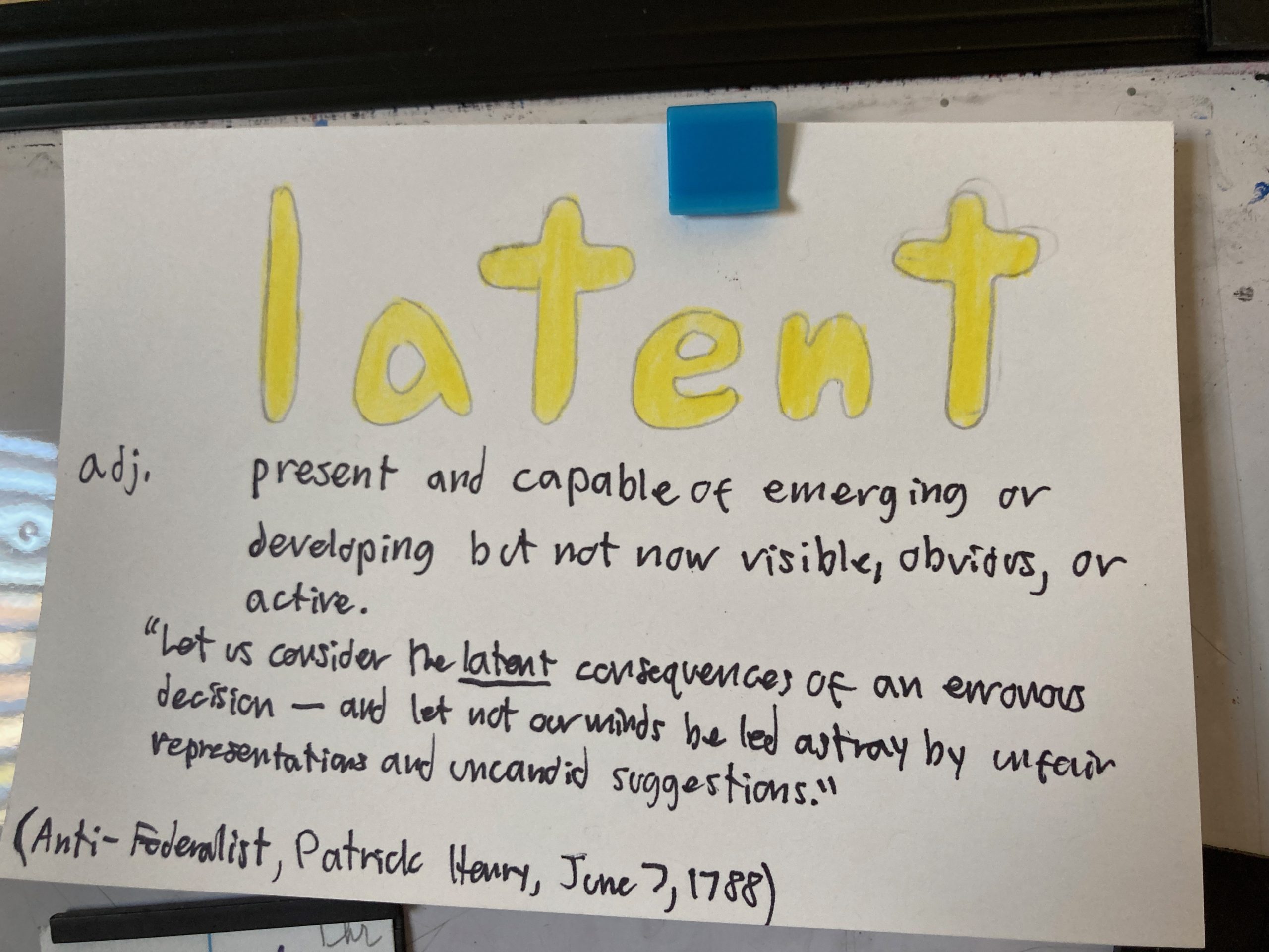 - Latent – adj. Present and capable of emerging or developing but not now visible, obvious, or active.