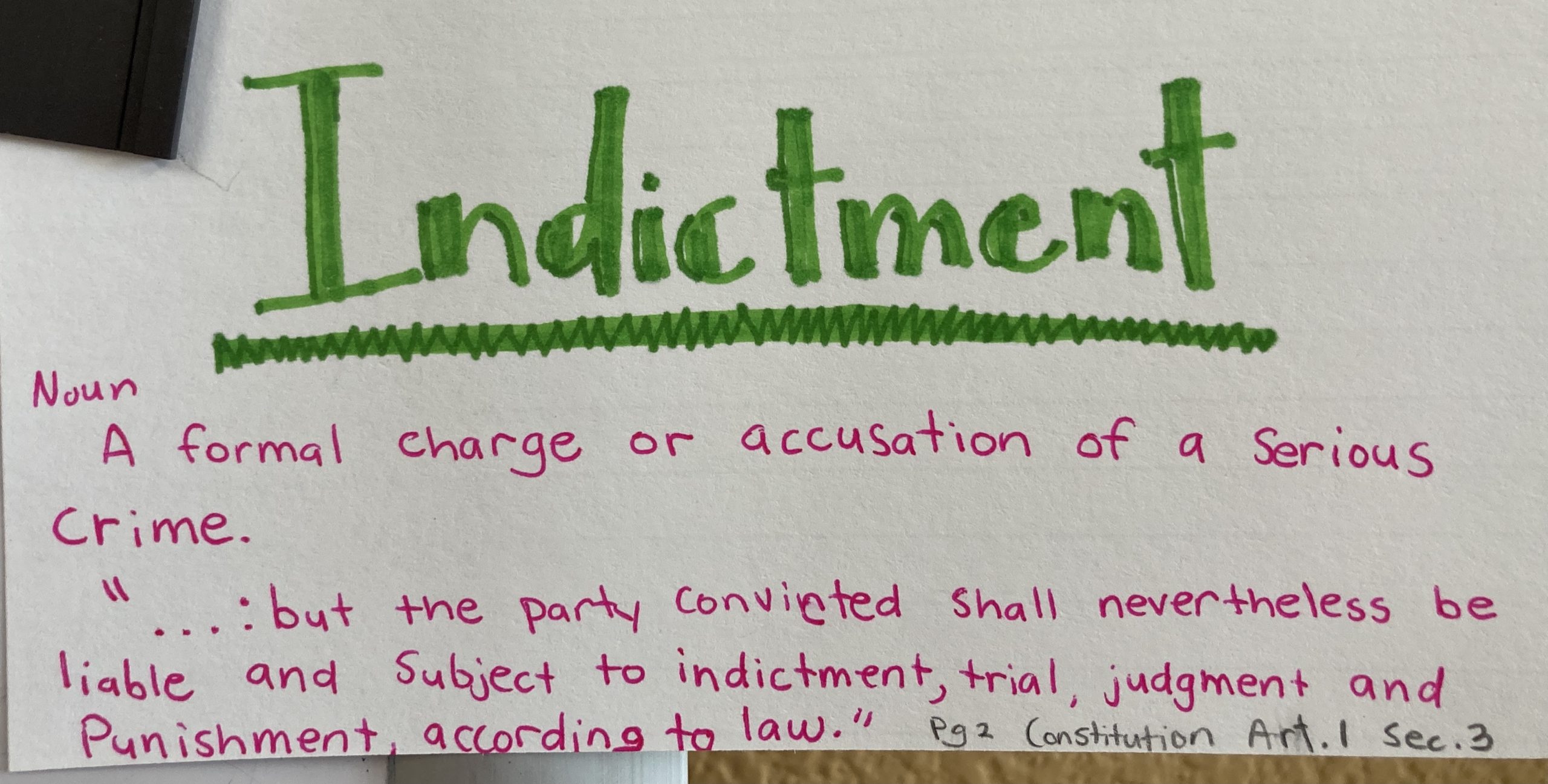 - Indictment – n. A formal charge or accusation of a series of crime.