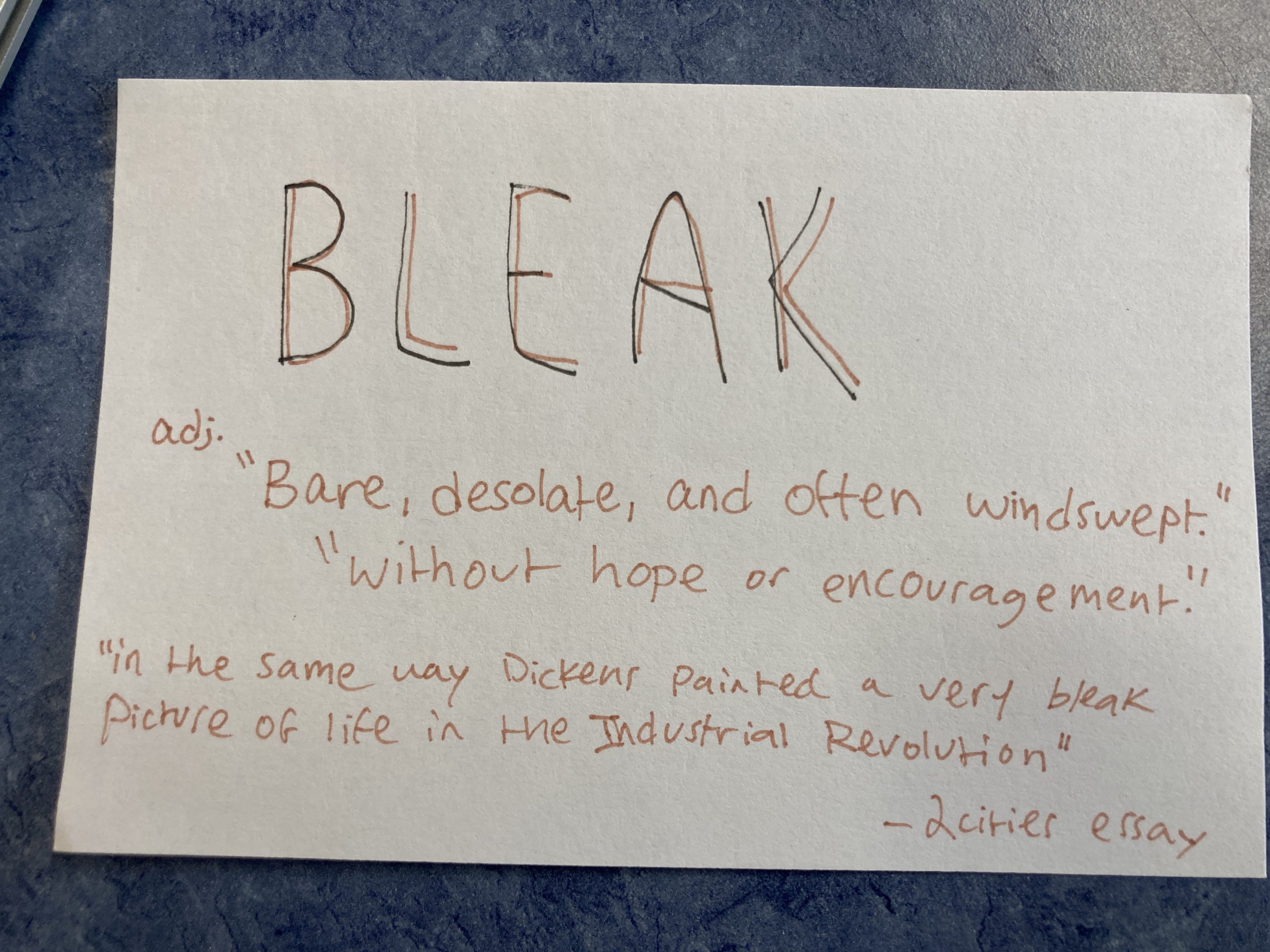 - Bleak – adj., Bare, desolate, and often windswept. Without hope or encouragement.