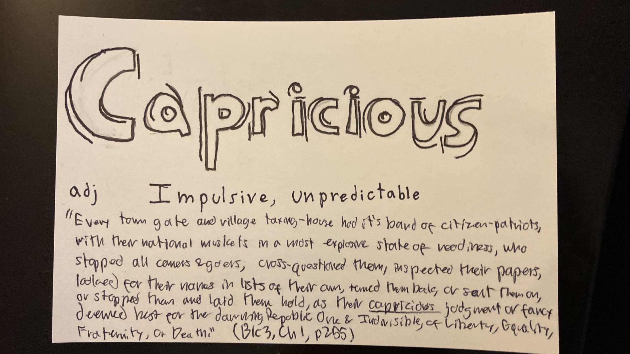 - Capricious – adj, impulsive or unpredictable.