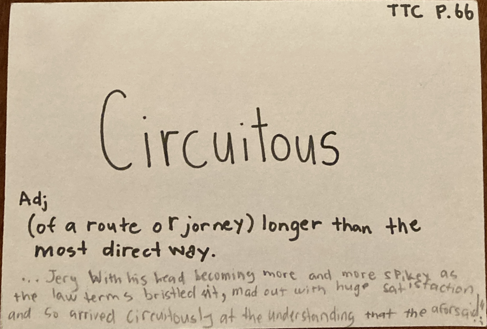 - Circuitous – adj., (of a route or journey) longer than the most direct way.