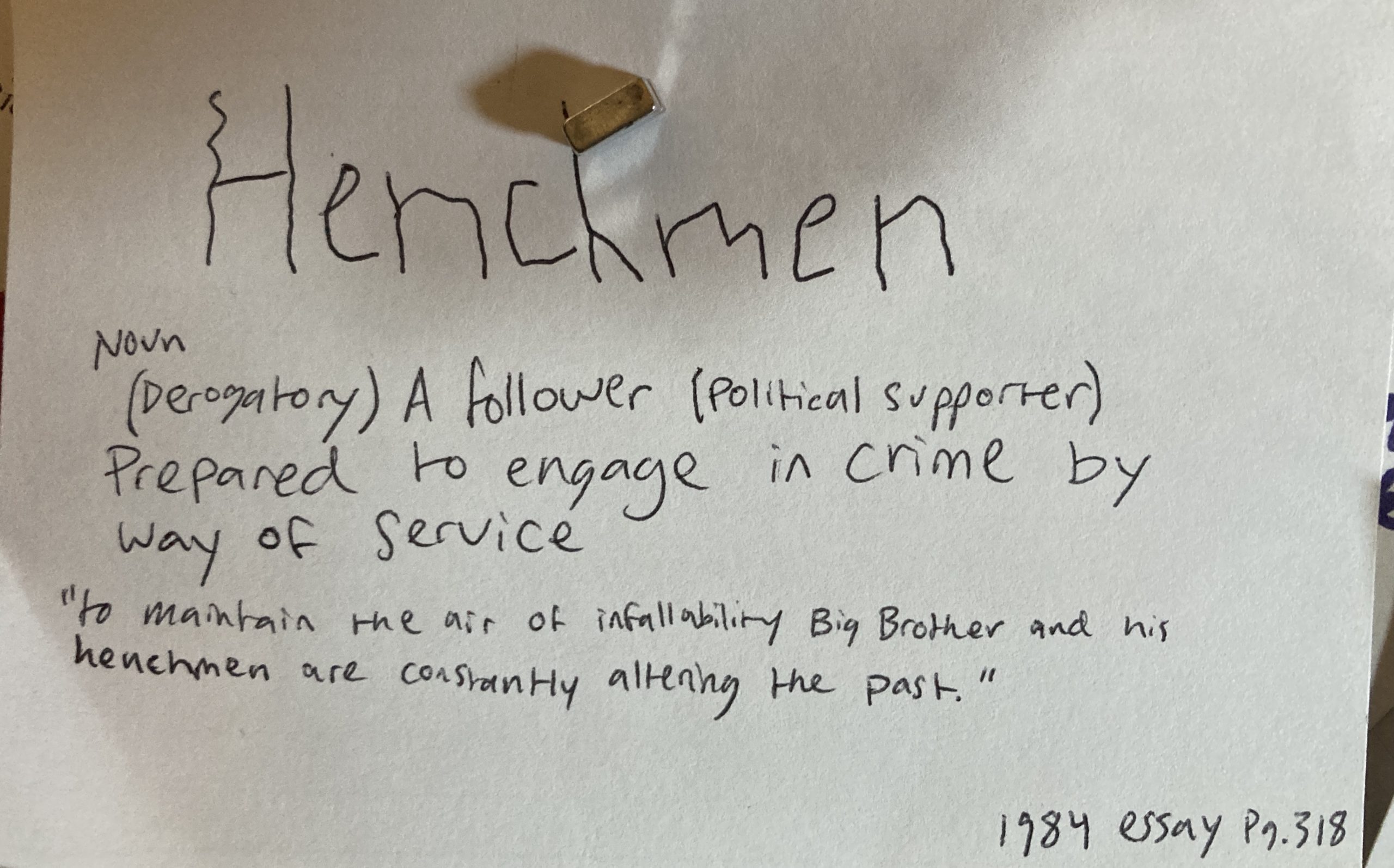 - Henchmen – n. (derogatory) A follower (Political supporter) prepared to engage in crime by way of service.