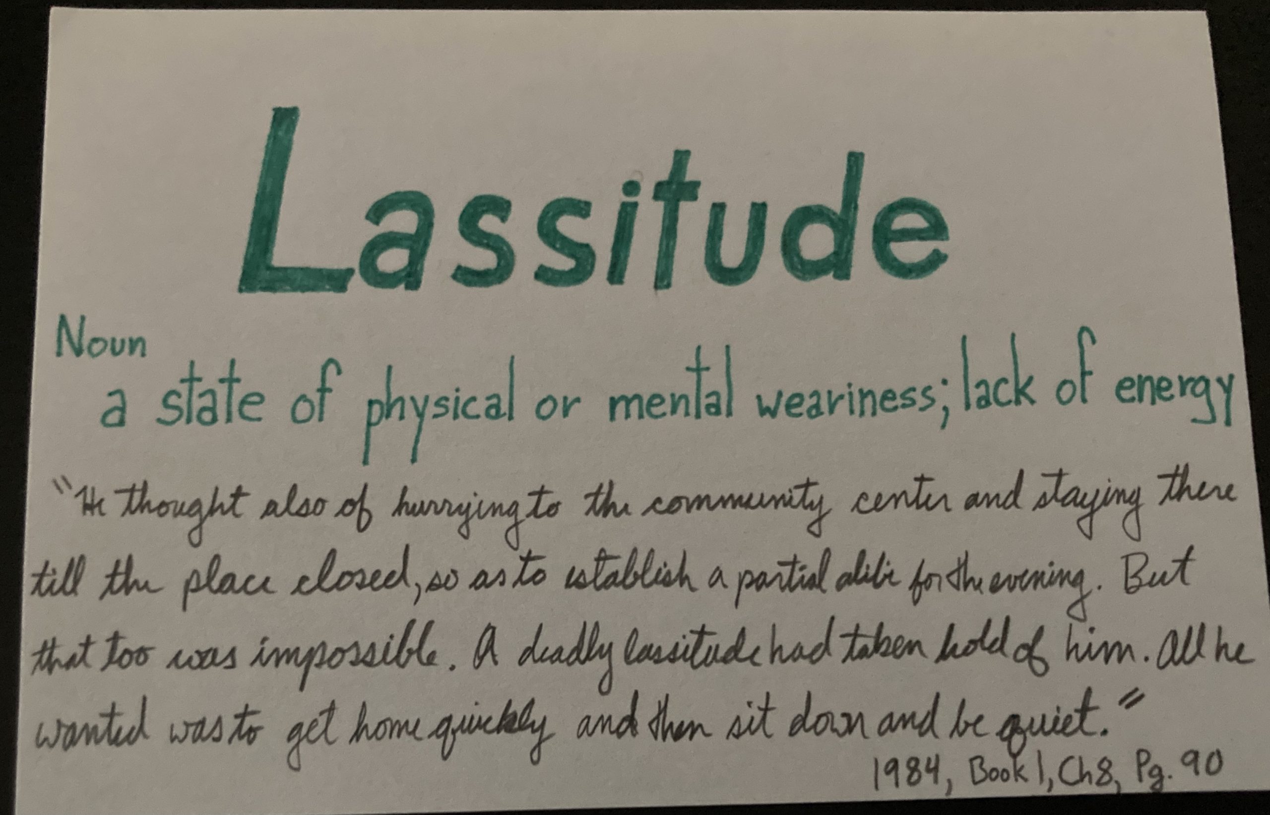 - Lassitude – n. a state of physical or mental weariness; lack of energy.