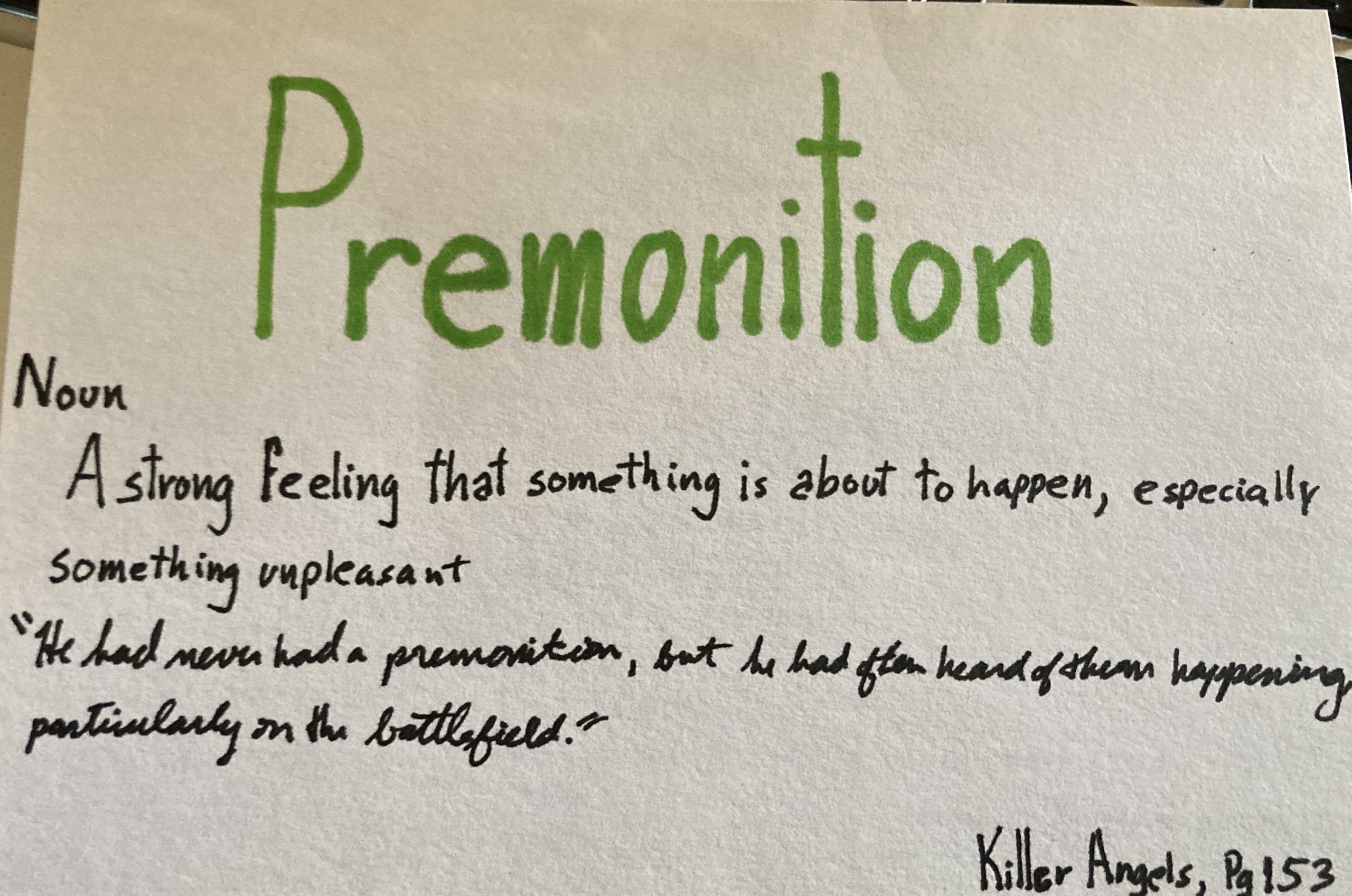 - Premonition – n. A strong feeling that something is about to happen, especially something unpleasant.