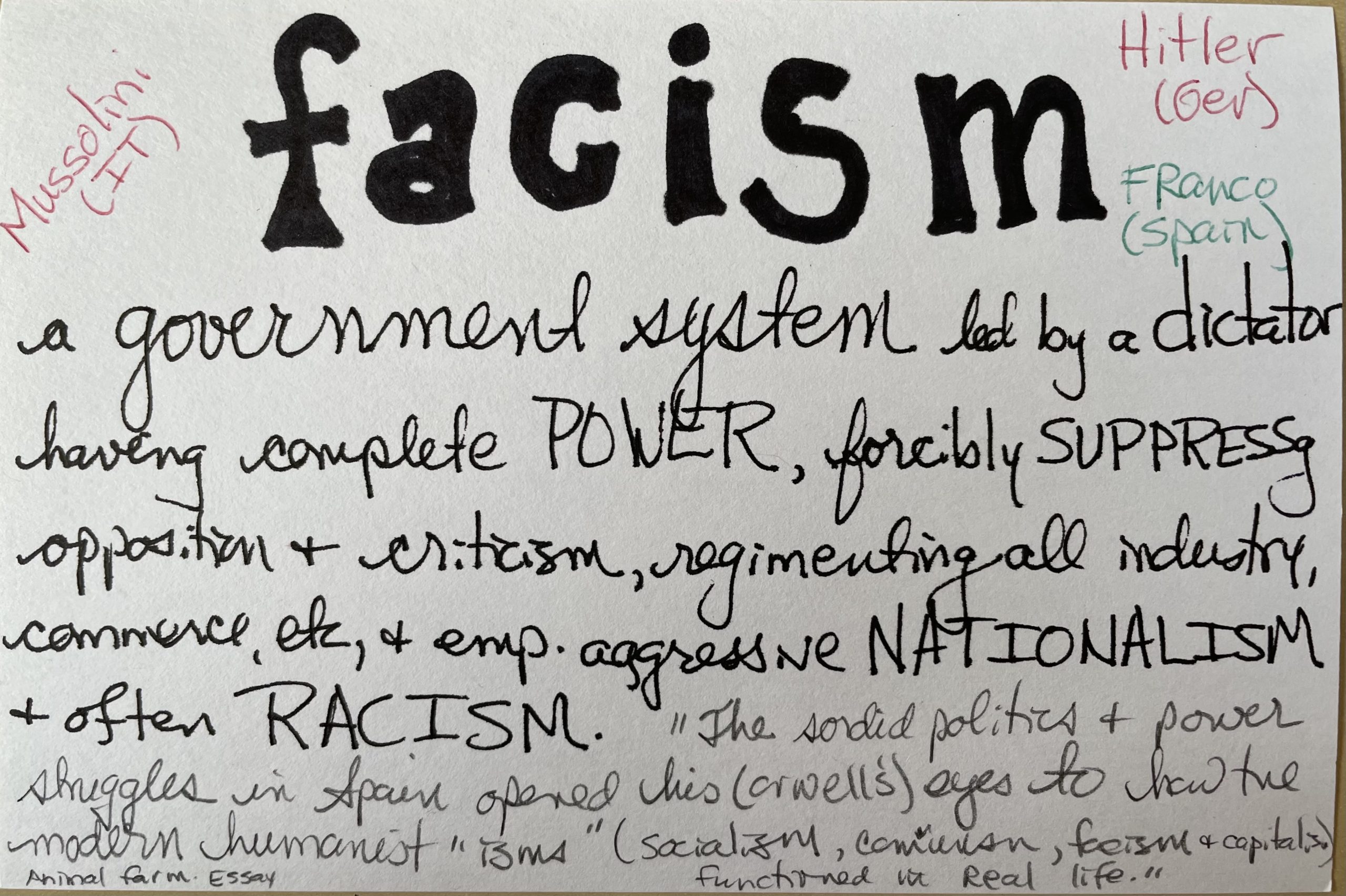 - Facism – a government system led by a dictator having complete POWER, forcibly SUPPRESSING opposition & criticism, regimenting all industry, commerce, etc, & emp. aggressive NATIONALISM & often RACISM.