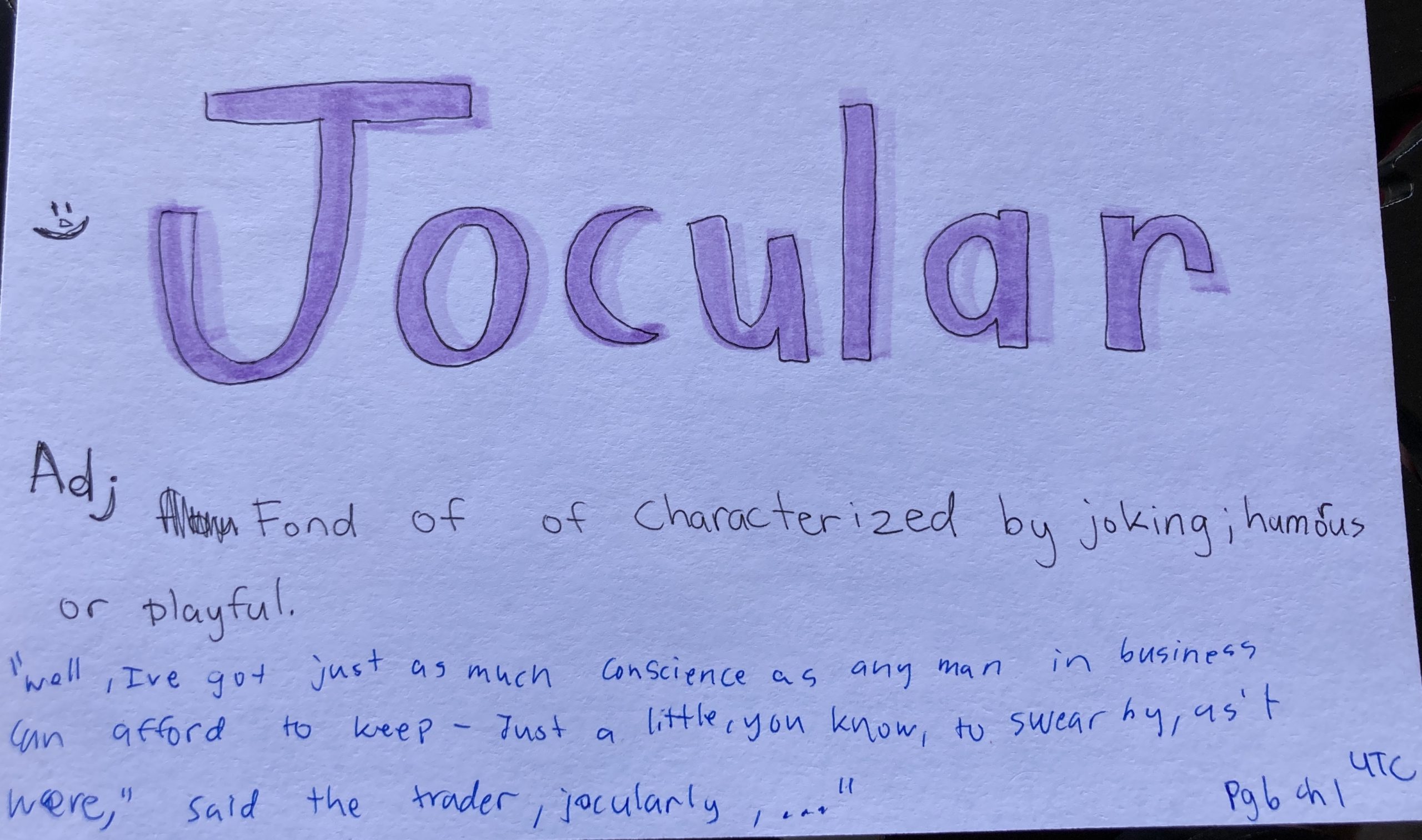 - Jocular – adj. Fond of or characterized by joking; humorous or playful.