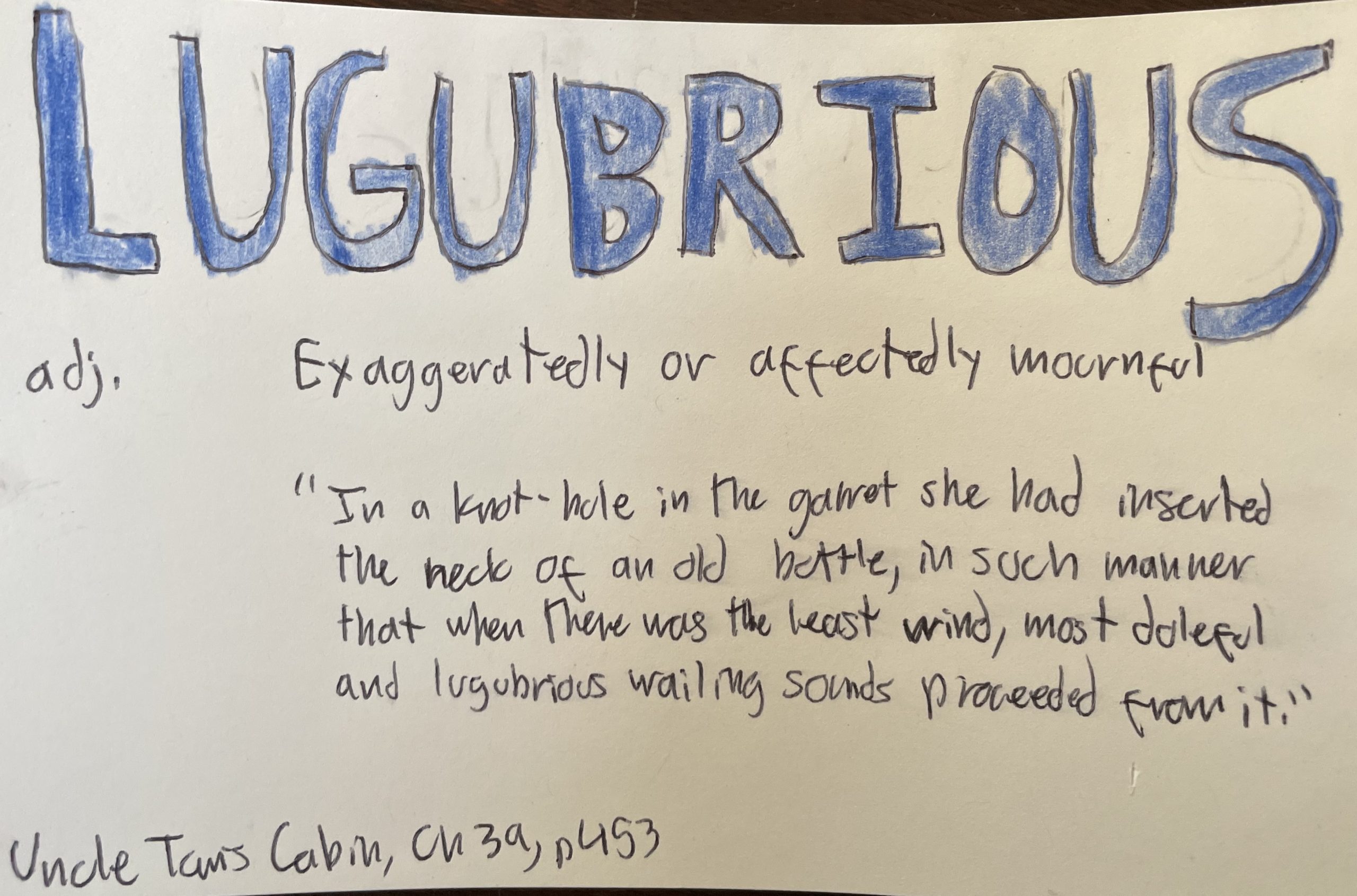 - Lugubrious – adj., Exaggeratedly or affectedly mournful.