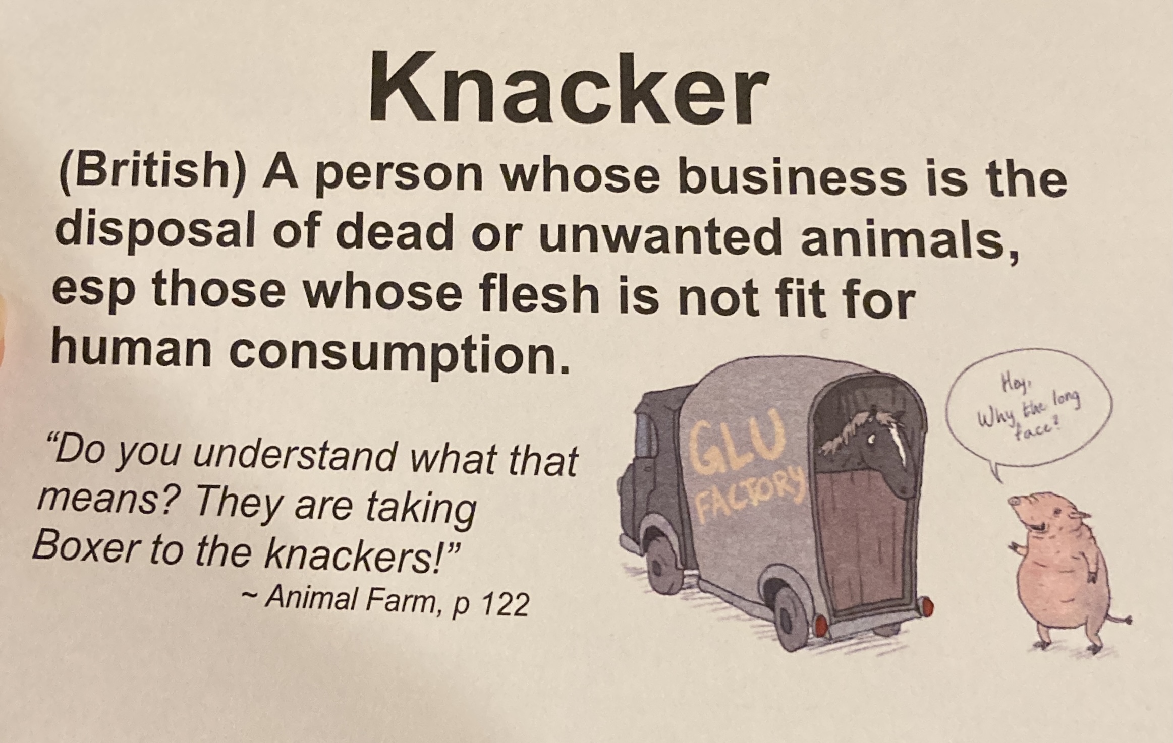 - Knacker – (British) A person whose business is the disposal of dead or unwanted animals, esp those whose flesh is not fit for human consumption.