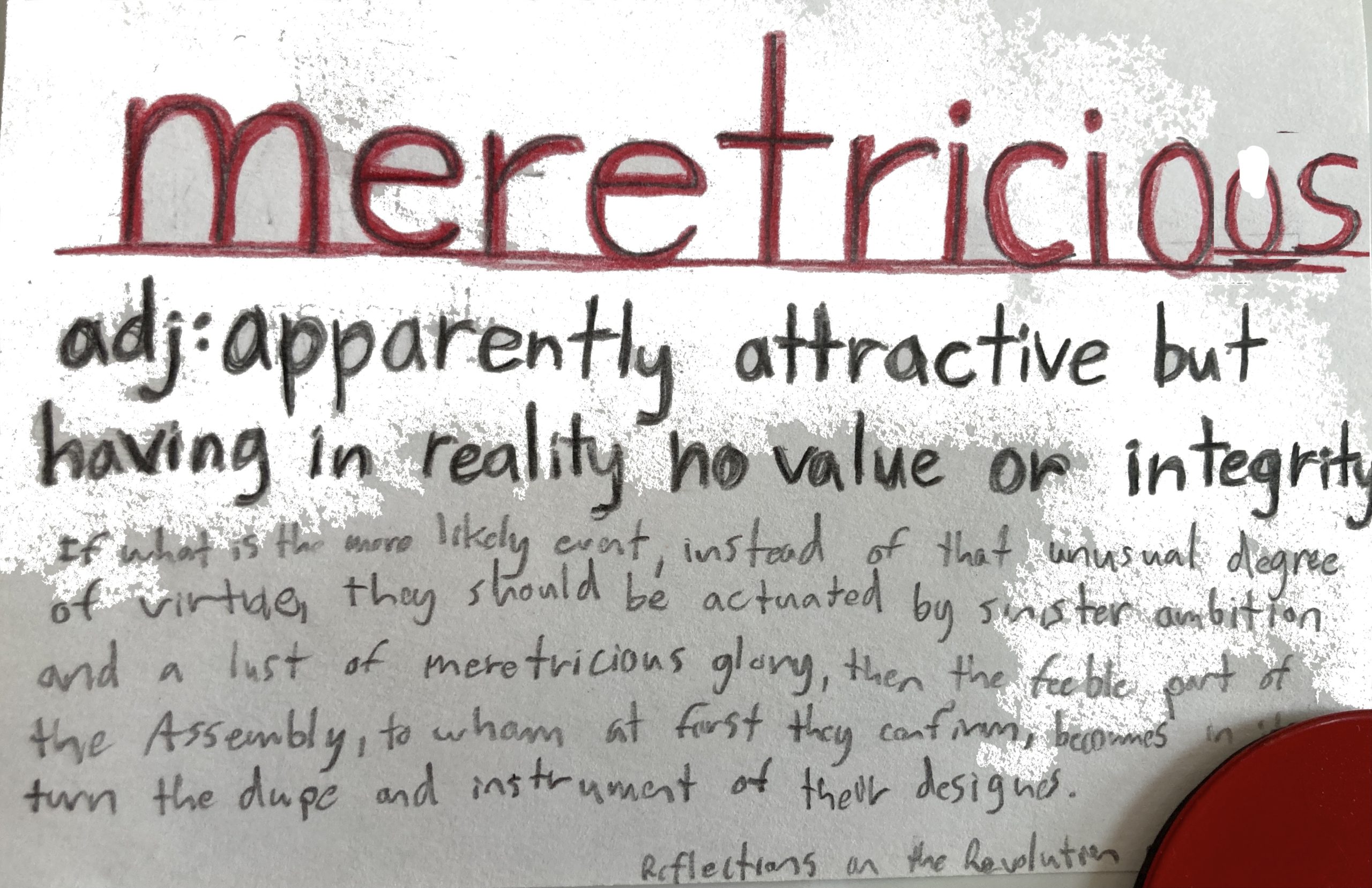 - Meretricious – adj. apparently attractive but having in reality no value or integrity.