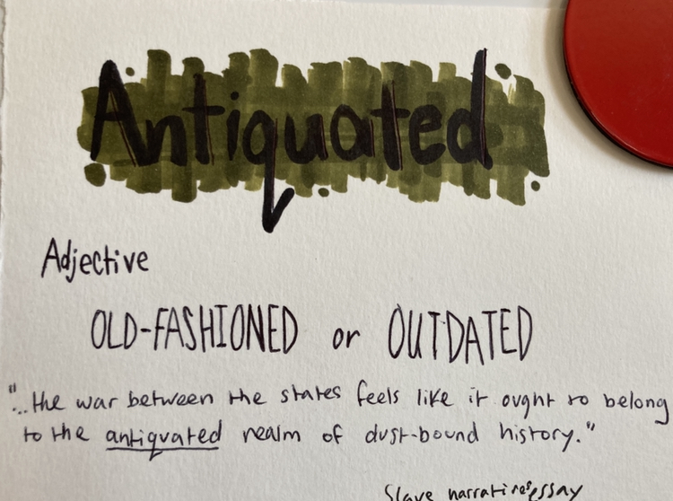 - Antiquated – adj. Old Fashioned or outdated.
