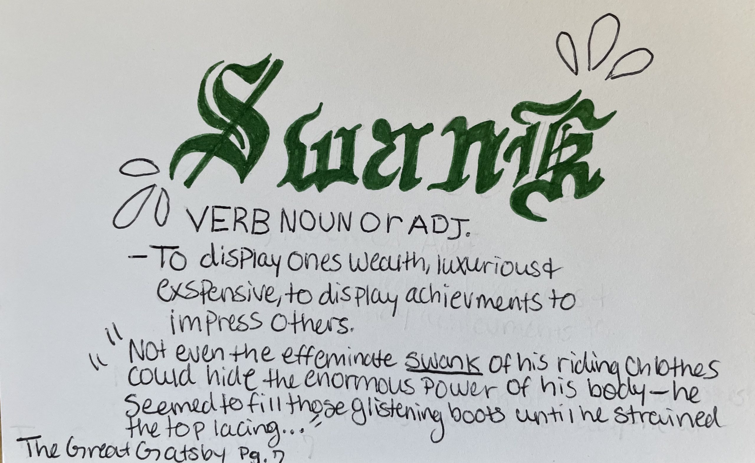 - Swank – v, n or adj. To display ones wealth, luxurious and expensive, to display achievements to impress others.