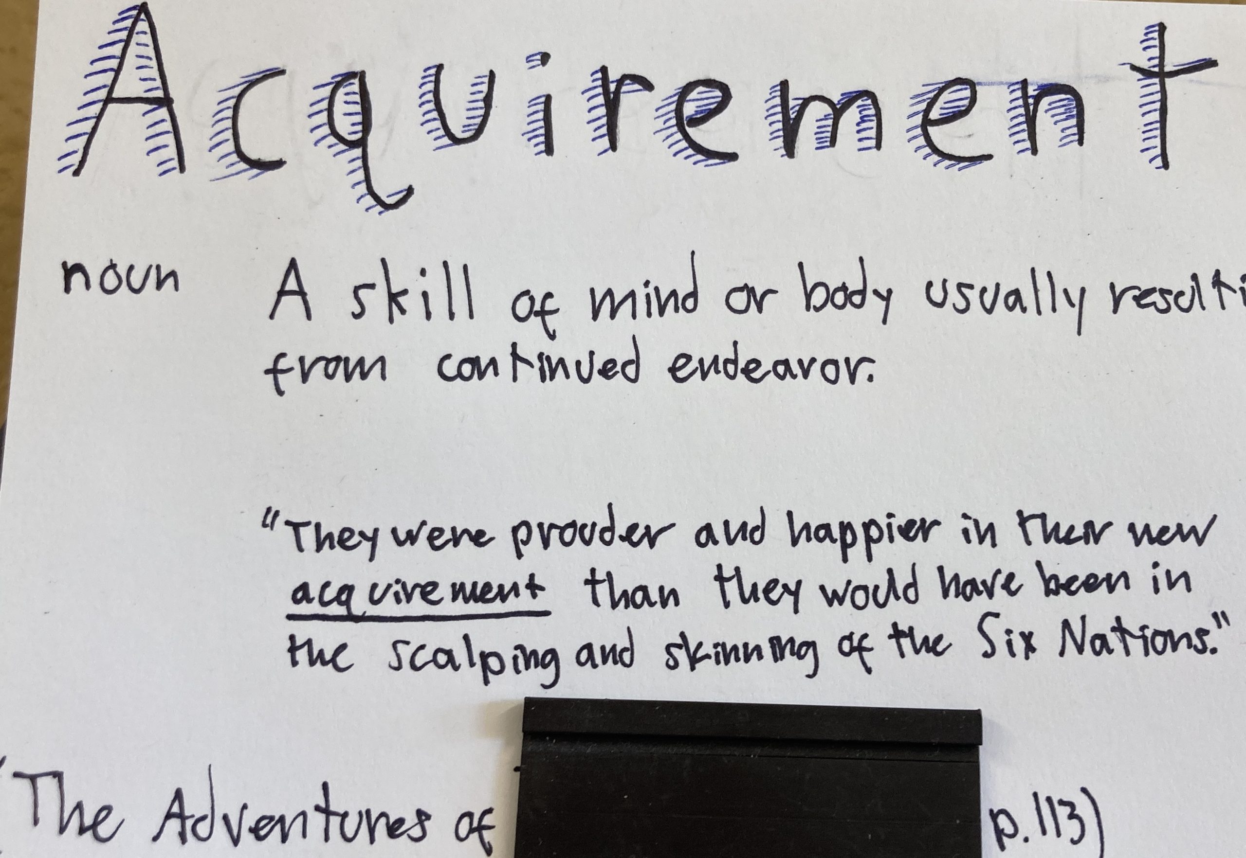 - Acquirement – n. A skill of mind or body usually resulting from continued endeavor.