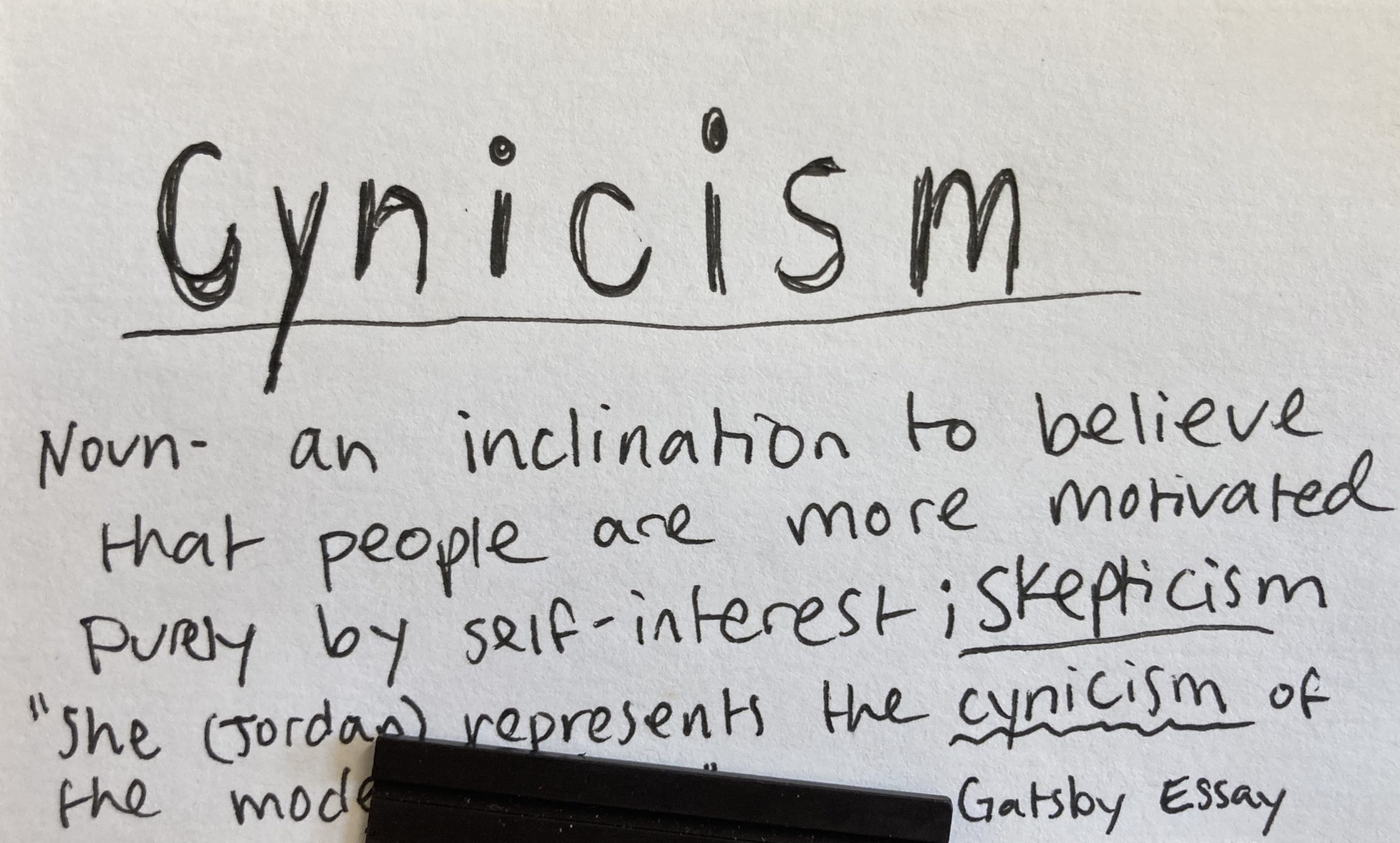 - Cynicism – n. An inclination to believe that people are more motivated purely by self-interest ; skepticism.